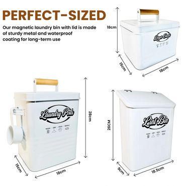 Keep your laundry room tidy with this versatile set of containers. The 18L x 15W x 28H cm laundry pods container holds over 150 laundry pods, the 18L x 15W x 18H cm dryer sheets box fits up to 30 dryer sheets, and the 18.5L x 9W x 26H cm lint bin is perfect for lint disposal. Ideal as laundry room organization and storage solutions.